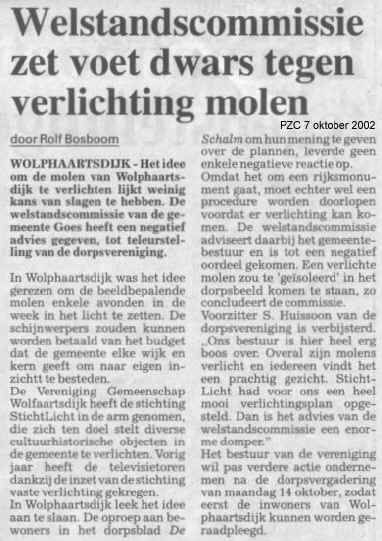 Provinciale Zeeuwse Courant 7 oktober 2002 - Welstandscommissie zet voet dwars tegen verlichting molen
