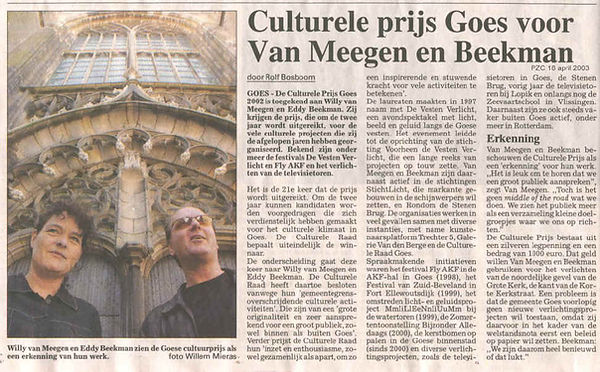 Provinciale Zeeuwse Courant 18 april 2003 - Culturele Prijs Goes voor Van Meegen en Beekman